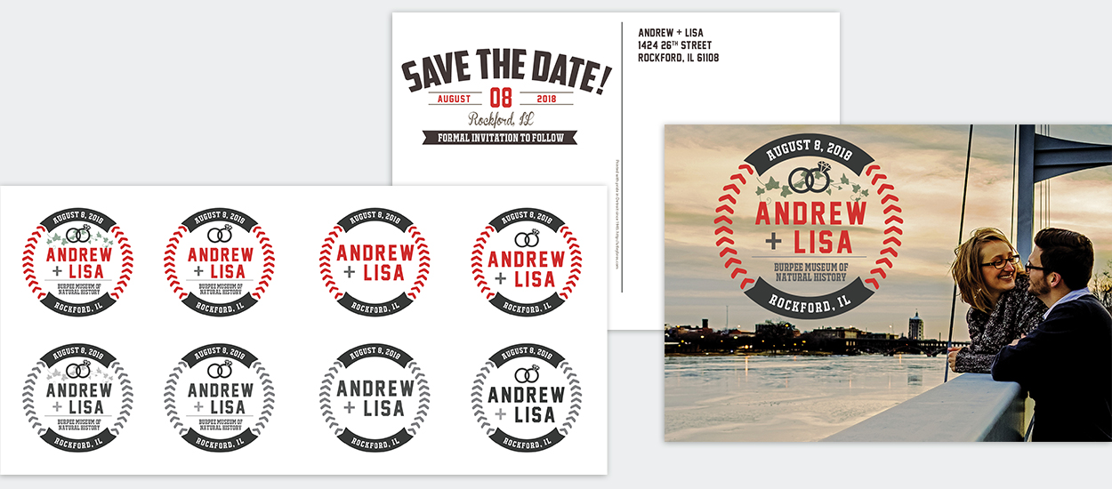 A Save The Date postcard with a logo treatment used throughout the wedding materials.