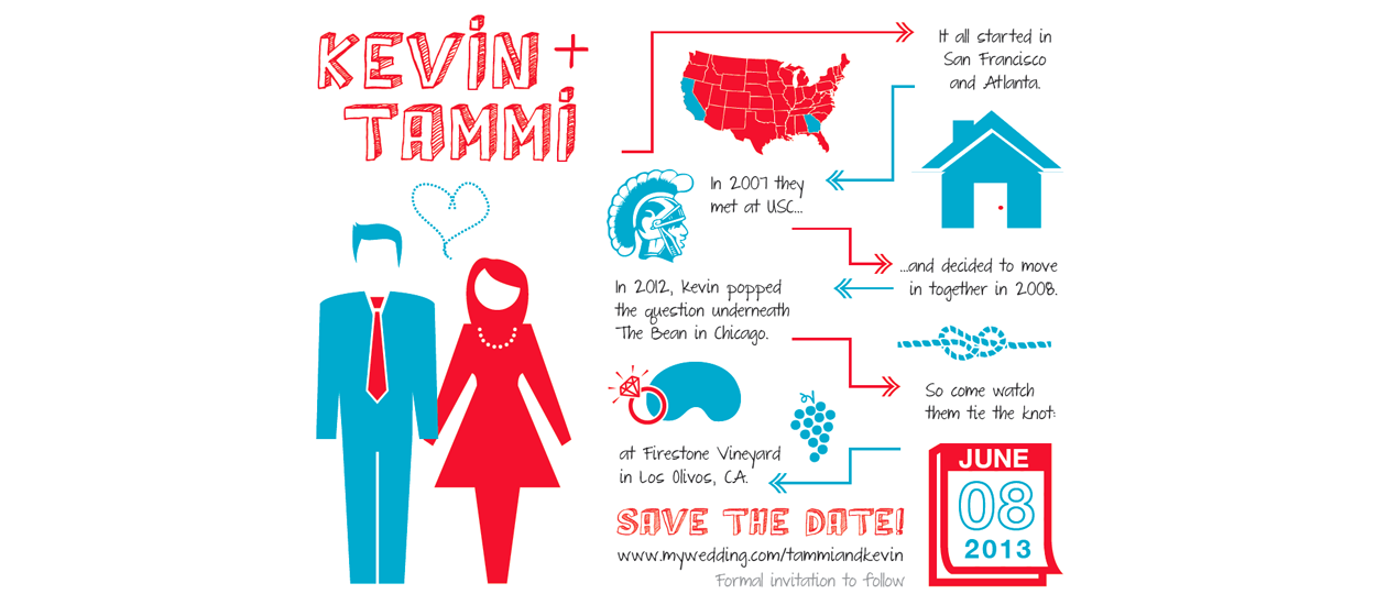 Another Save The Date postcard with a visual story of how they met, along with various large milestones of their relationship, and how we ended up here :).